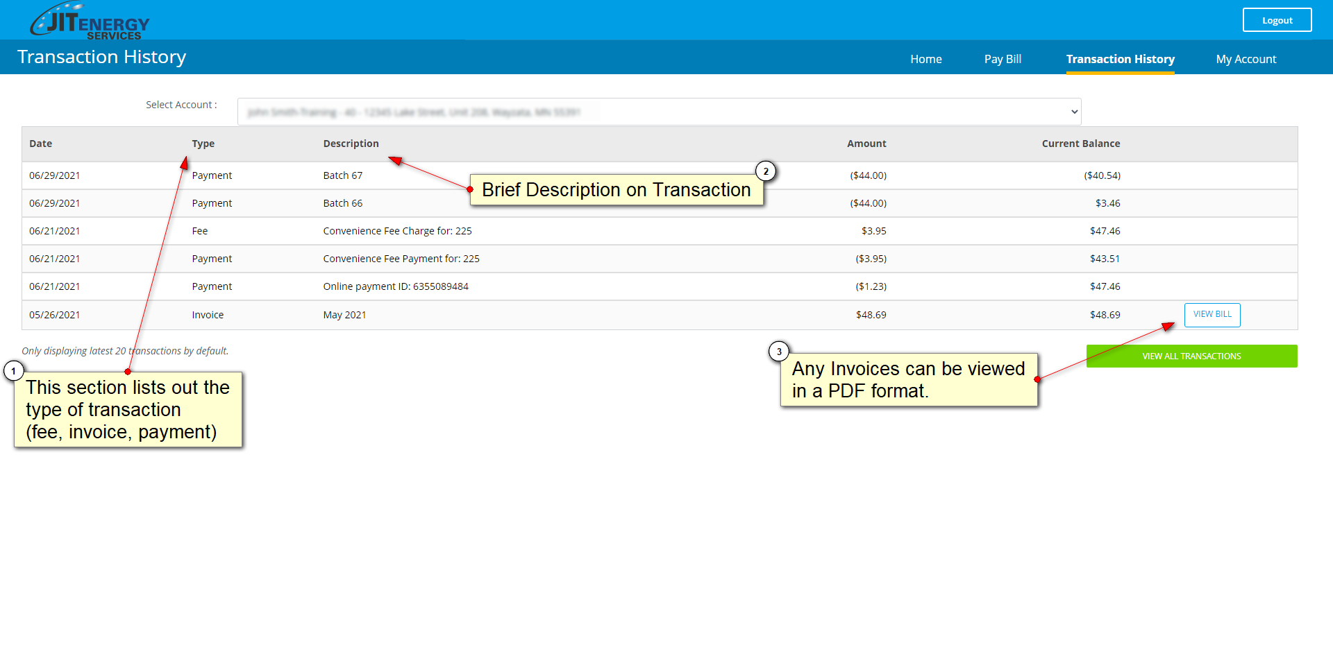 3. This tab will contain all your transaction history. If you want to view individual transactions/bills, go to Viewing Bills.