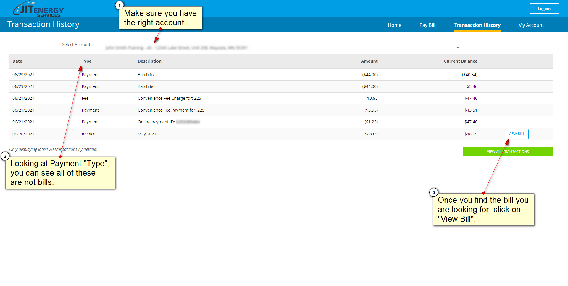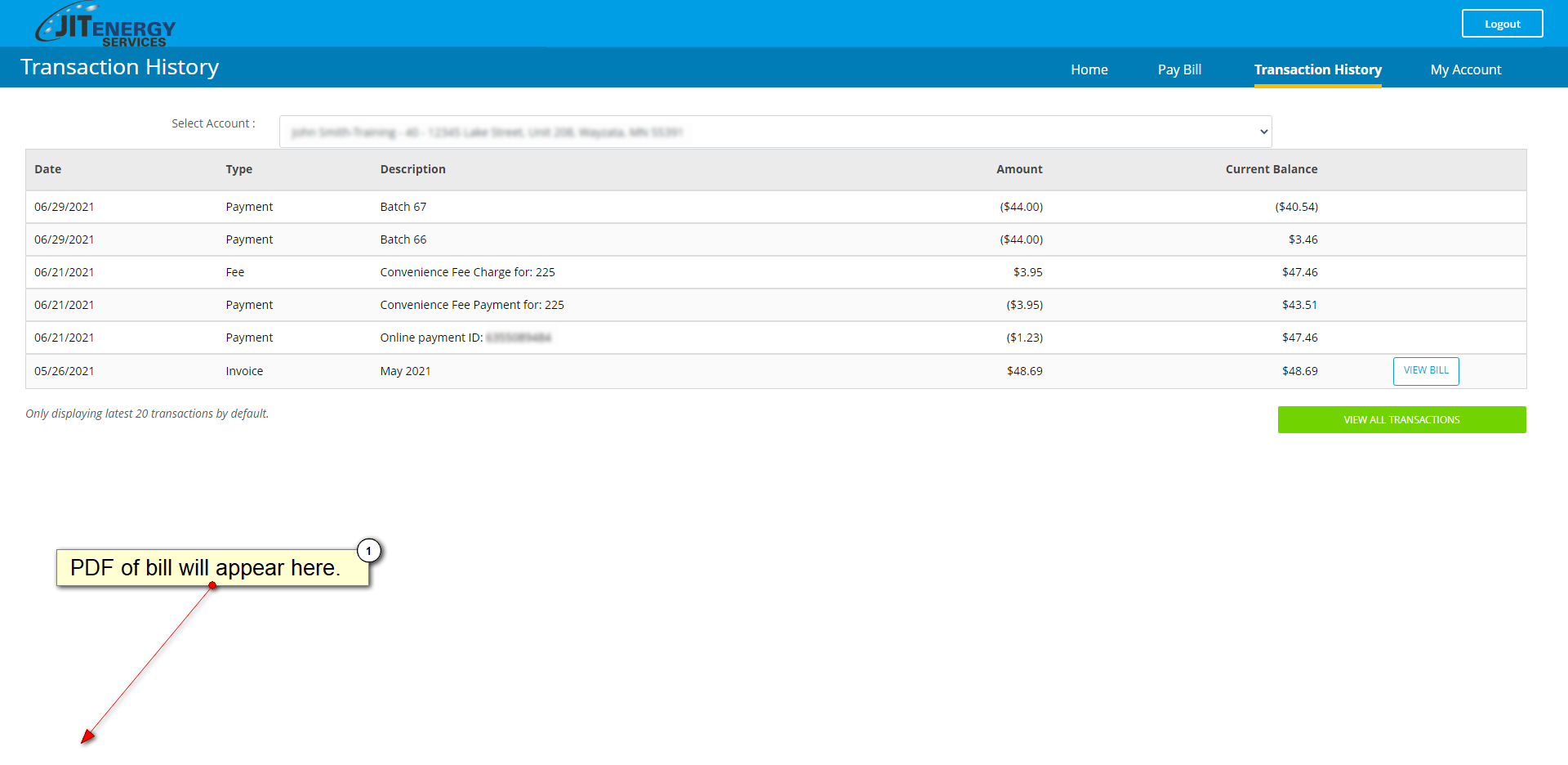 3. On the page, you will see your transaction history and, for every bill, there will be a "View Bill" tab on the right hand side.
